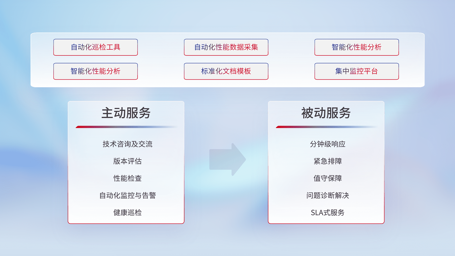 智能化工具和标准化文档,,,保障服务质量,,,提供主动服务(包含技术咨询、、、版本评估、、、、性能检查、、、、自动化监控与告警、、、、健康巡检)和被动服务包含(分钟级响应、、、紧急排障、、、、值守保障、、、、问题诊断解决、、SLA服务)。。