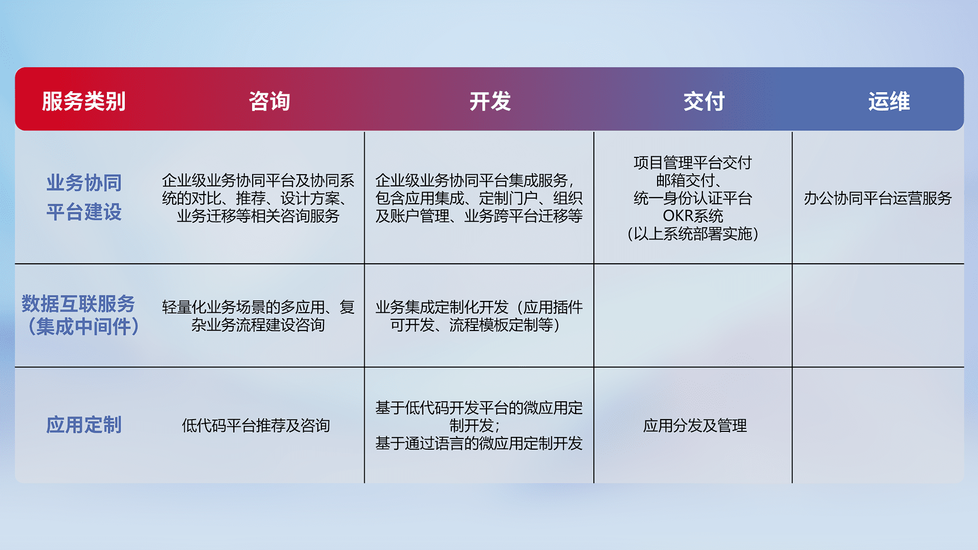 针对钉钉、、、、企微、、、IDaas等平台级产品提供产品的规划、、、、方案、、、、交付、、、、定制化开发等服务,,,实现如统一协同办公、、智能客户服务、、、、混合会议管理、、、智能数据查询、、、等业务场景,,,实现数字化转型。。。